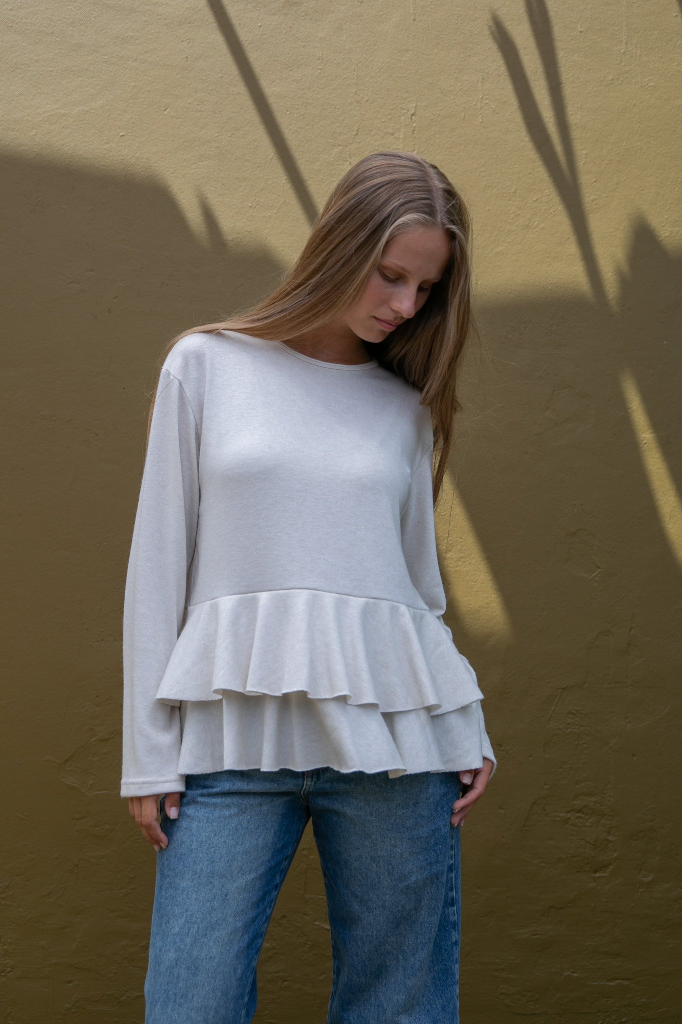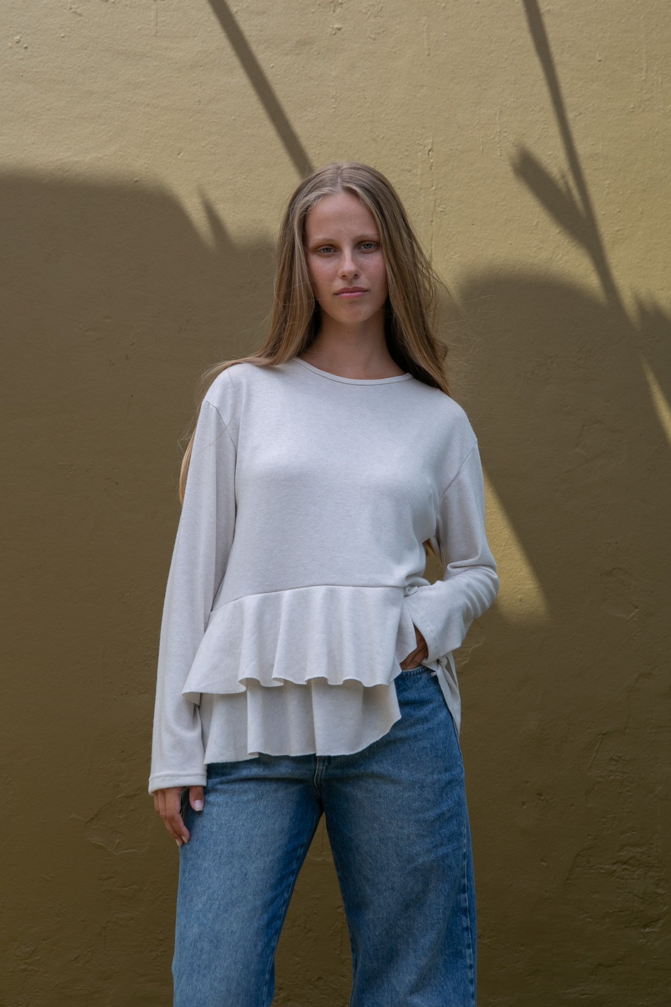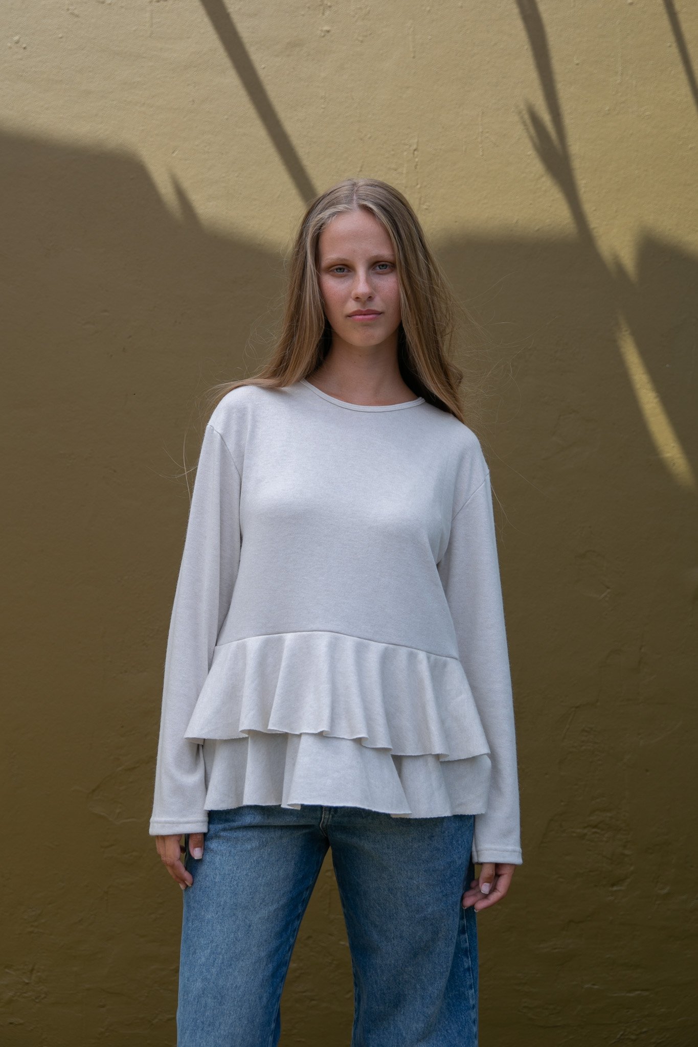 El Buzo Lucía está confeccionado en angora liso, un tejido suave y abrigado que aporta una sensación confortable al uso. Su diseño incorpora volados que suman un detalle femenino y delicado, elevando una prenda clásica a una opción ideal para looks de media estación y días más frescos.