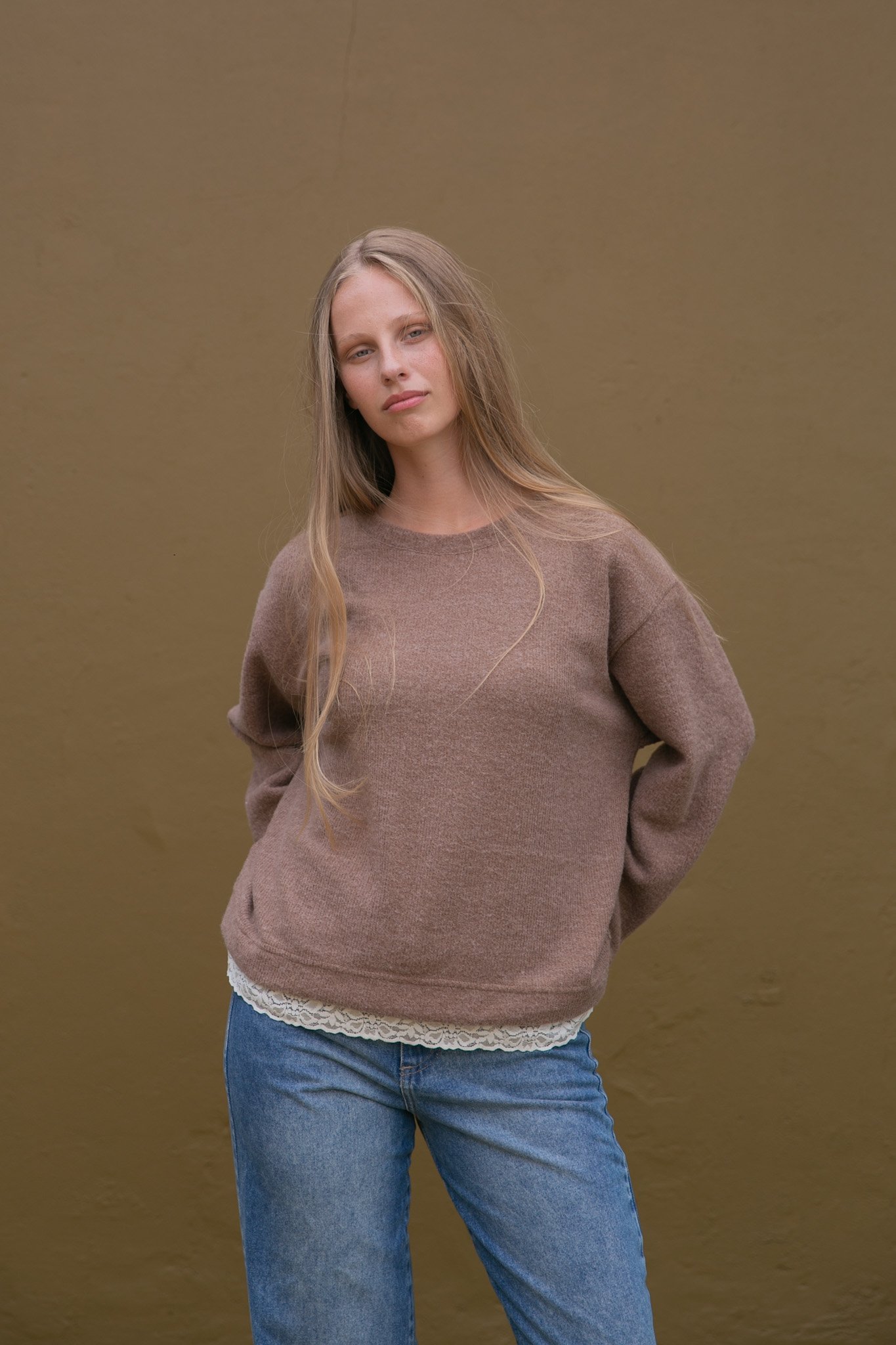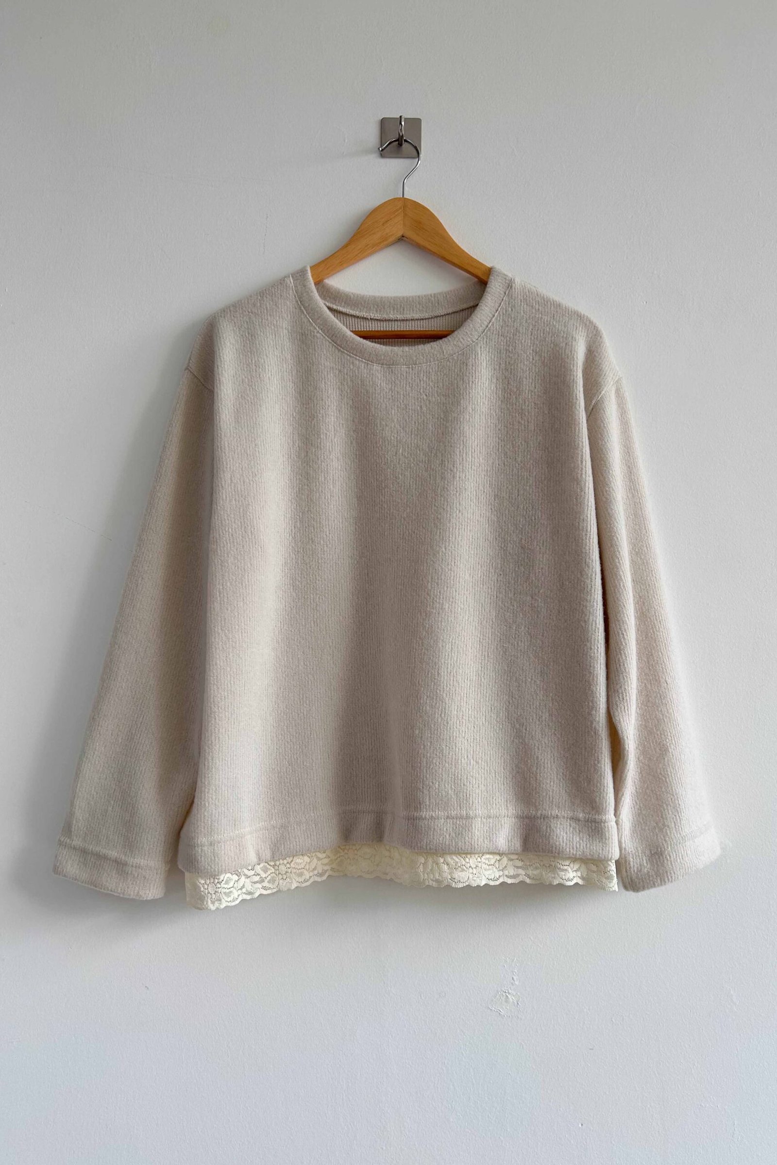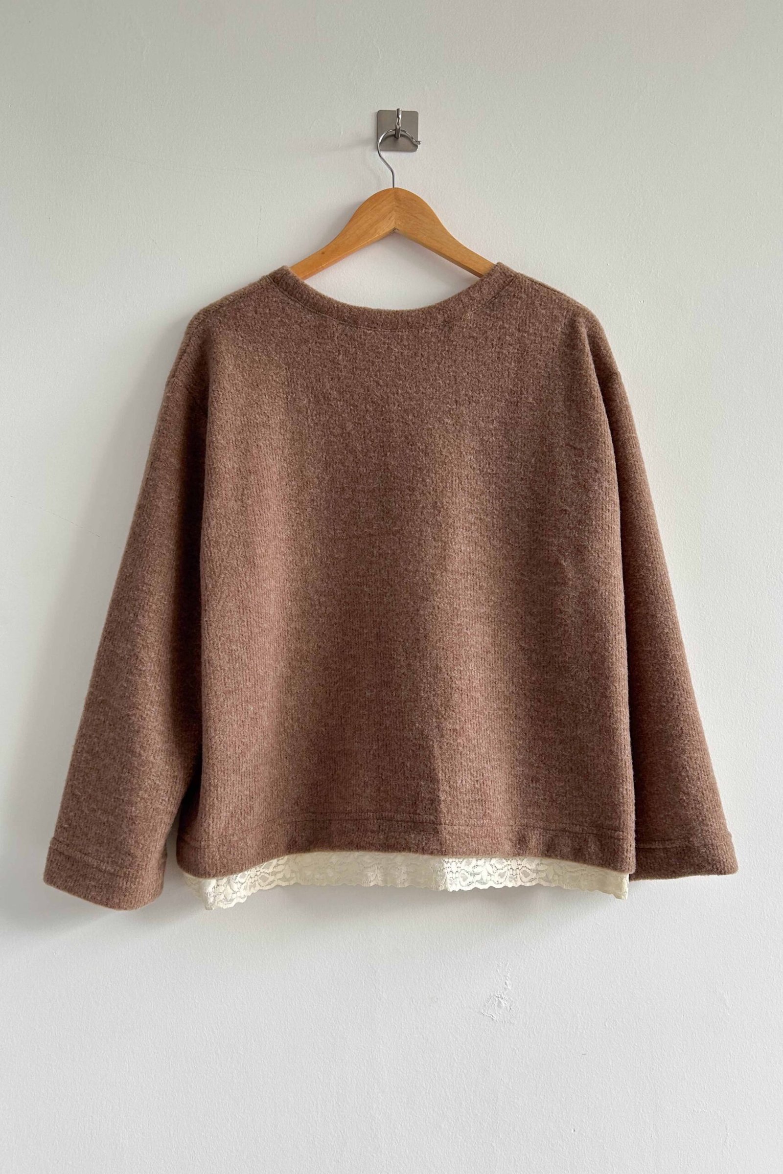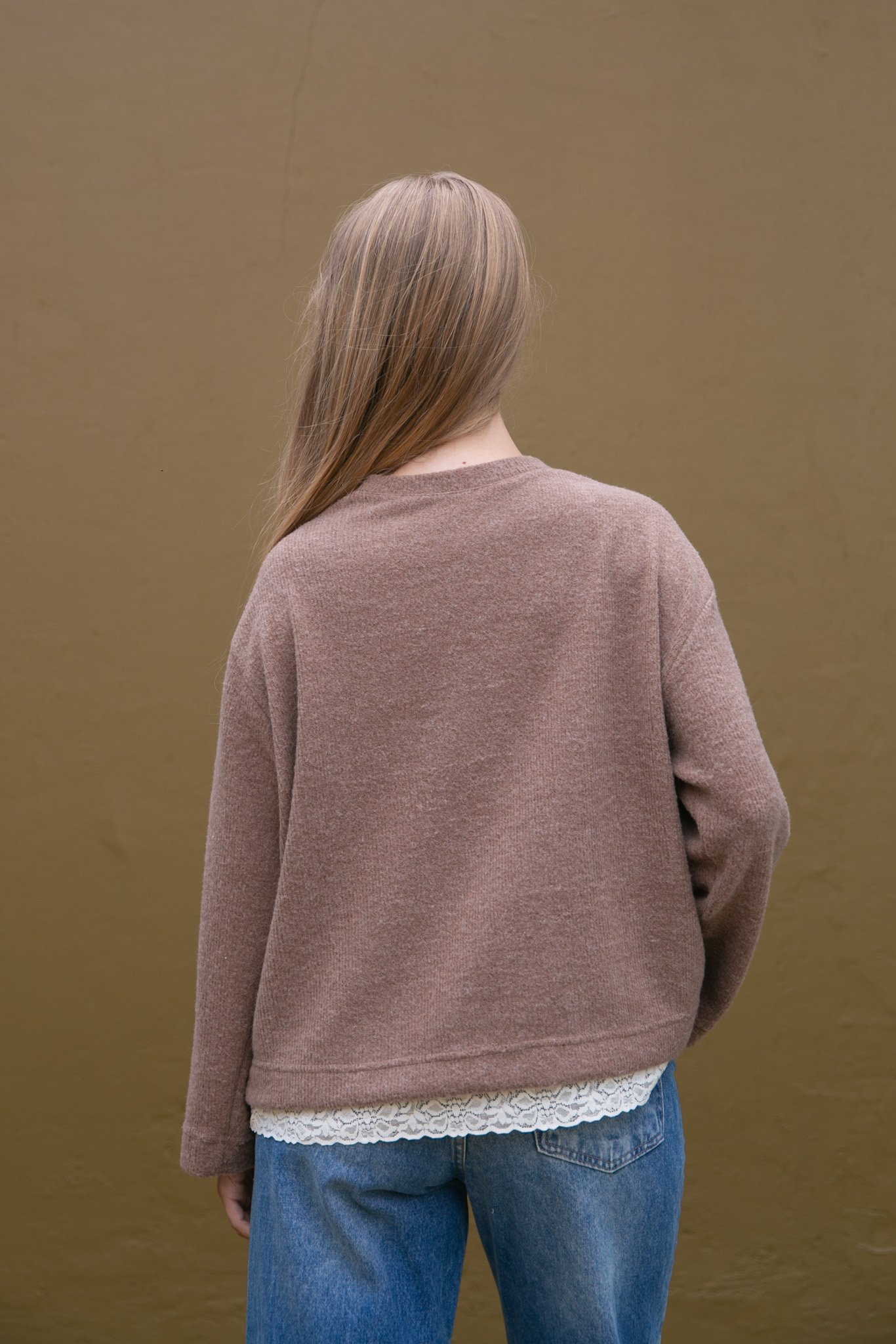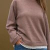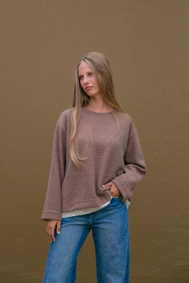 El Buzo Mara está confeccionado en tela mohair, es una prenda abrigada, liviana y suave al tacto. Su detalle con puntilla realza el diseño y suma un toque delicado a un clásico de uso diario.