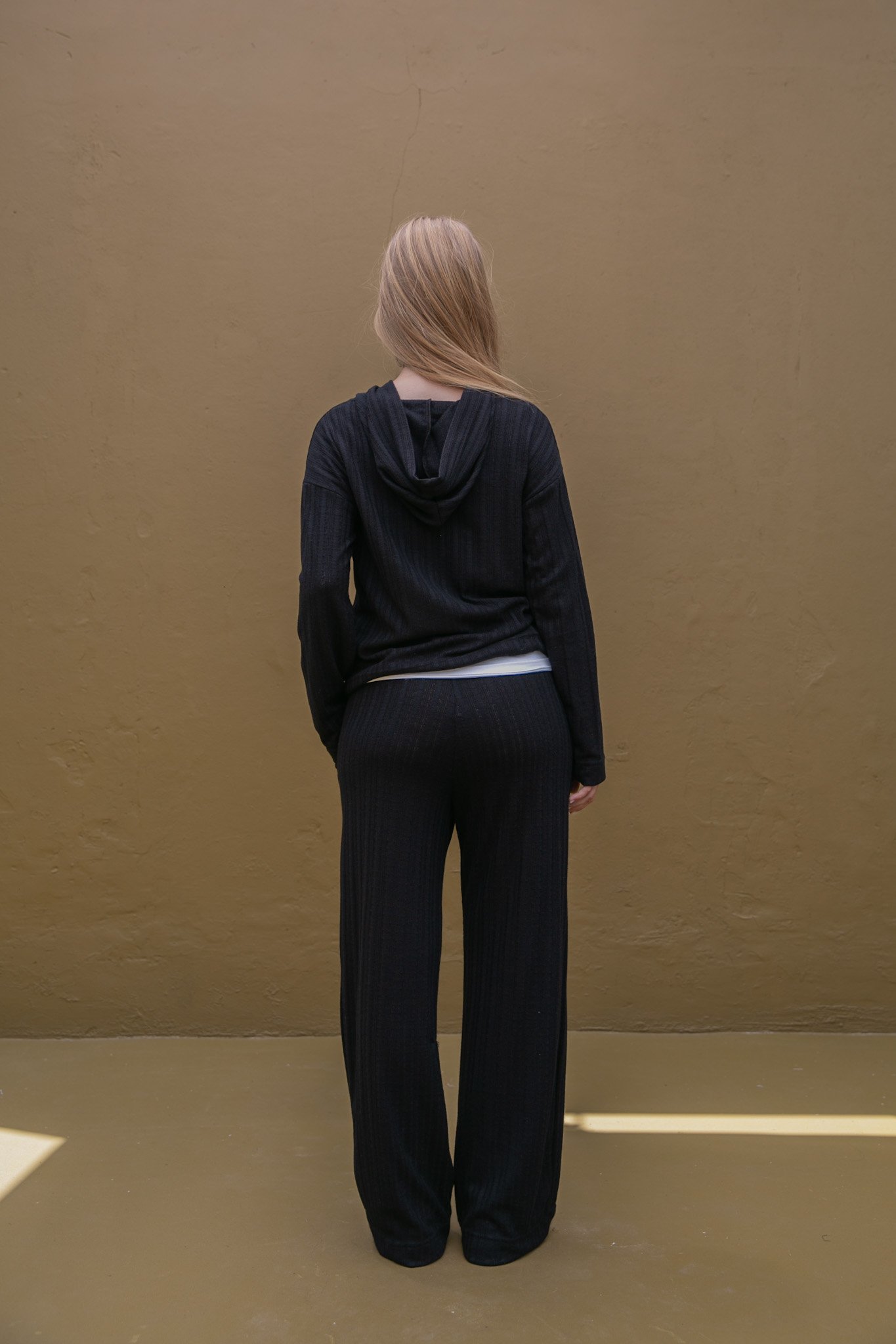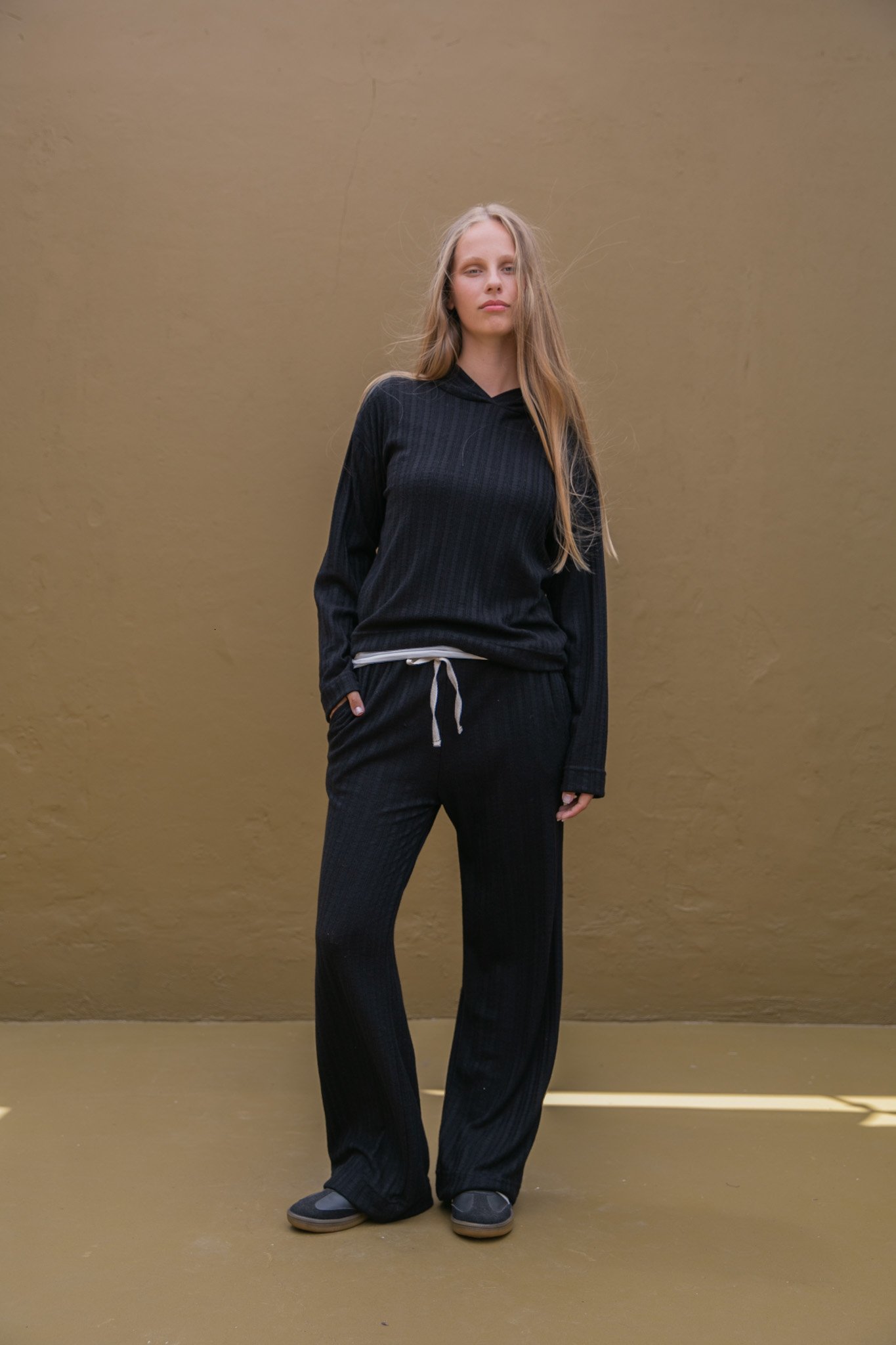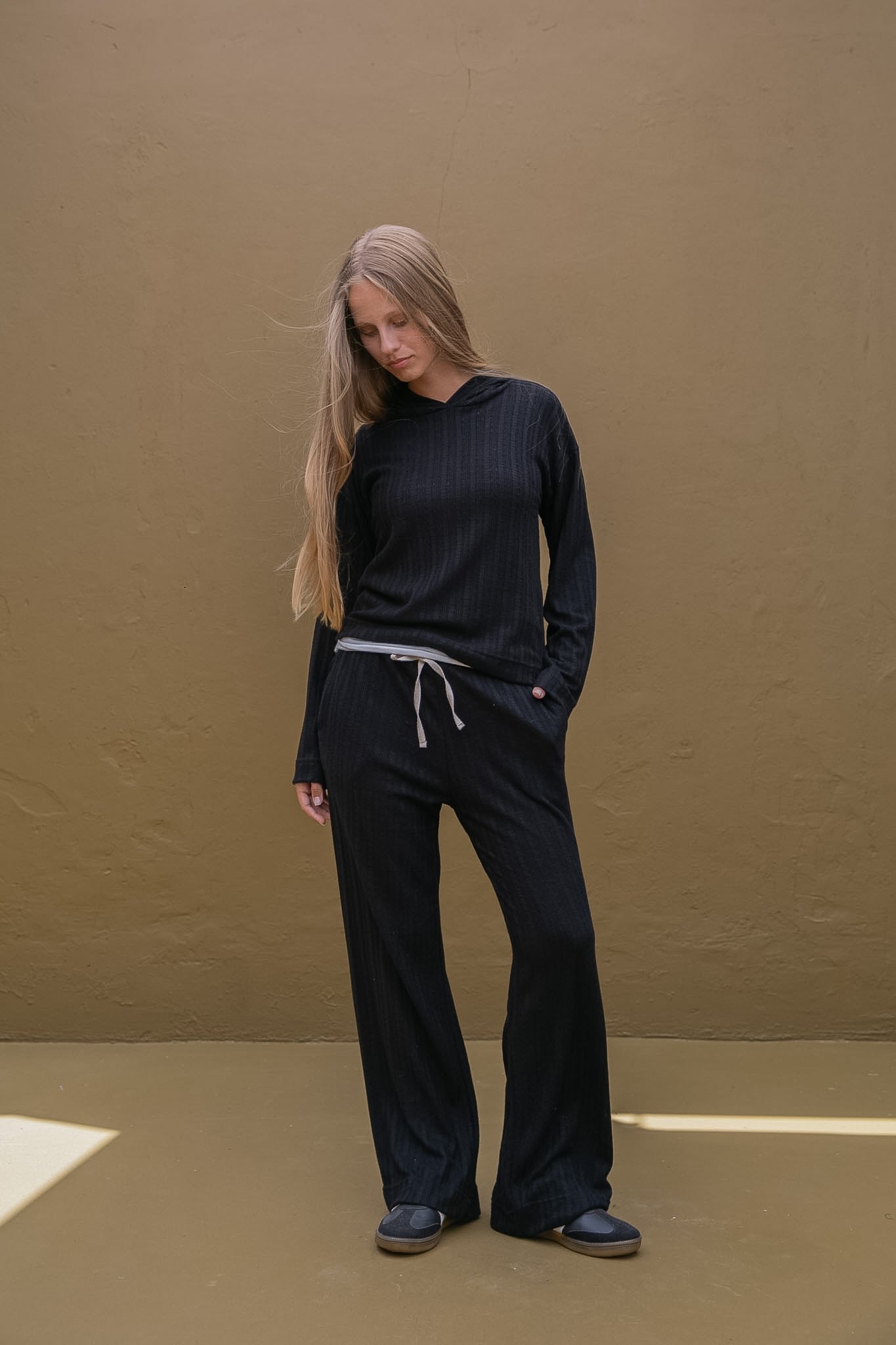 El Pantalón Rufina está confeccionado en angora trenzas, se destaca por su textura suave, cálida y con relieve, que aporta un diferencial visual sin perder versatilidad.