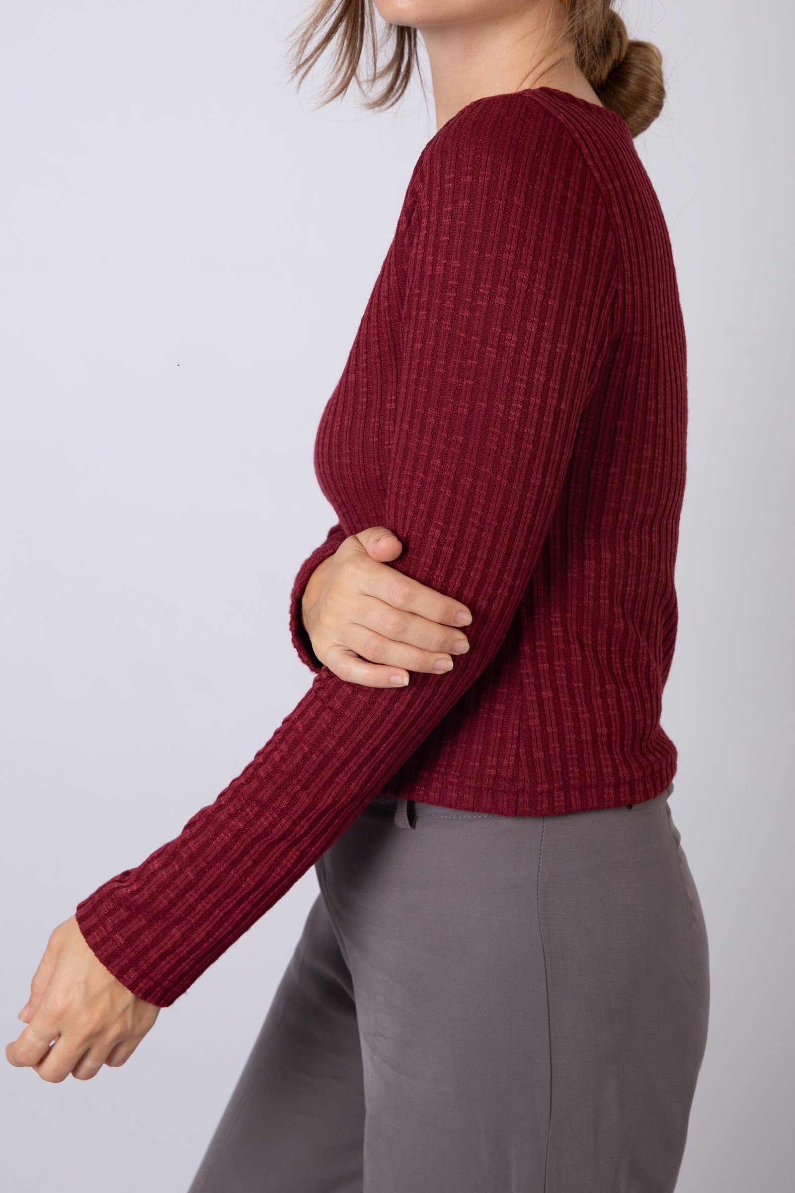 La remera Virginia está confeccionada en tejido Wang con textura acanalada que aporta elasticidad y un calce agradable al cuerpo. Su diseño de manga larga y largo levemente cropped la convierte en una opción moderna y fácil de combinar con jeans, pantalones o faldas. Ideal para usar sola o como base en looks de media estación e invierno.