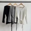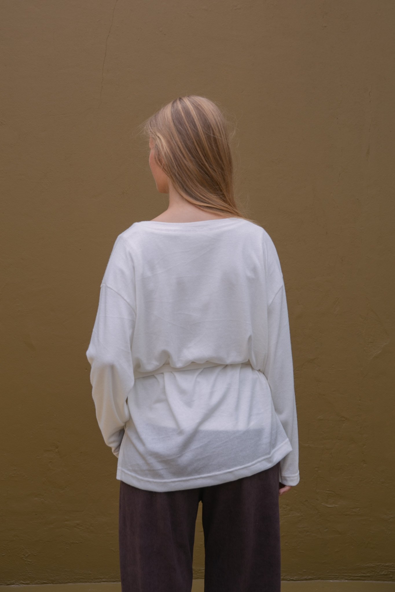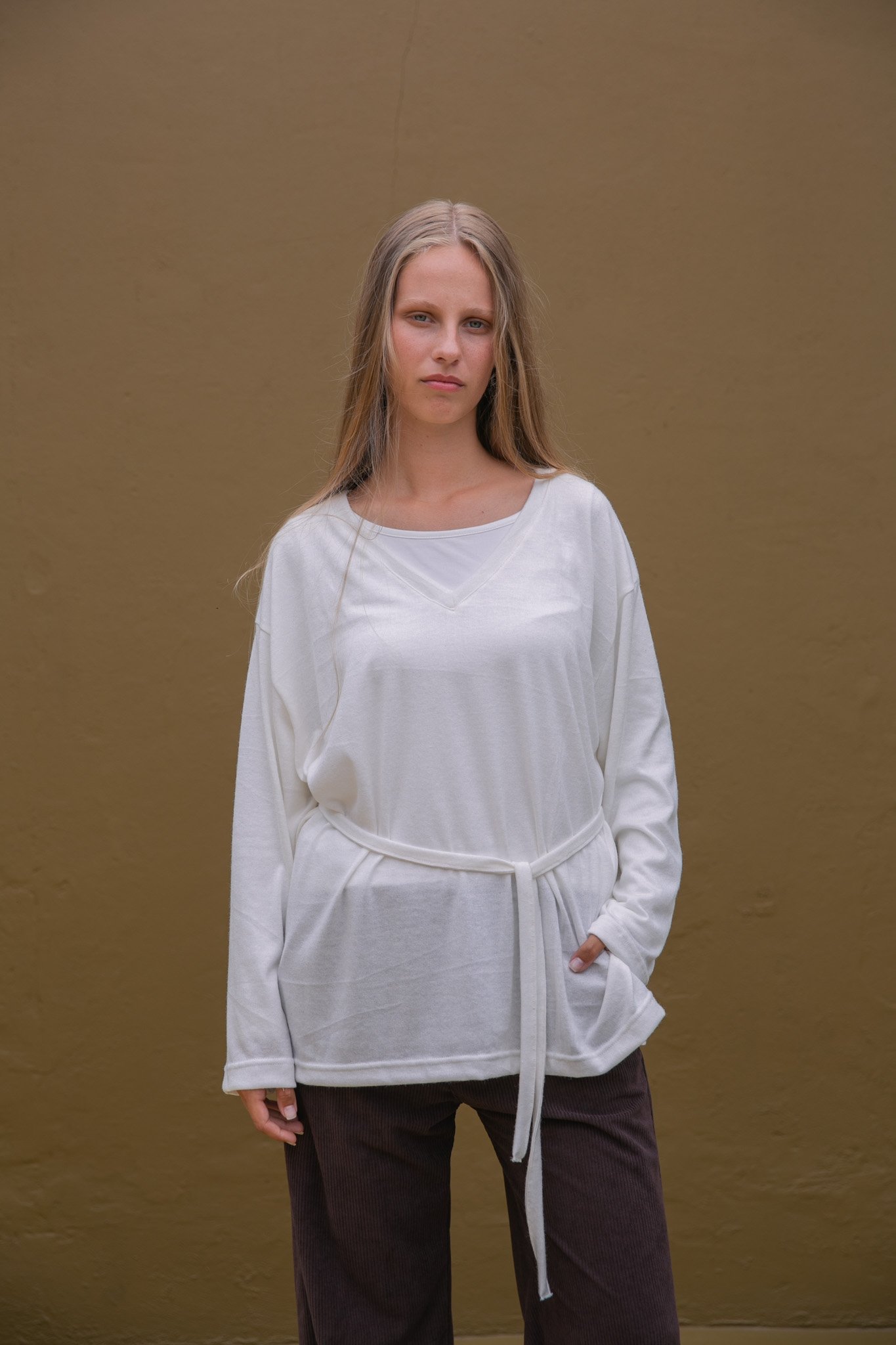 Marcando la cintura con la tira para usarlo tipo vestido corto o con leggings.